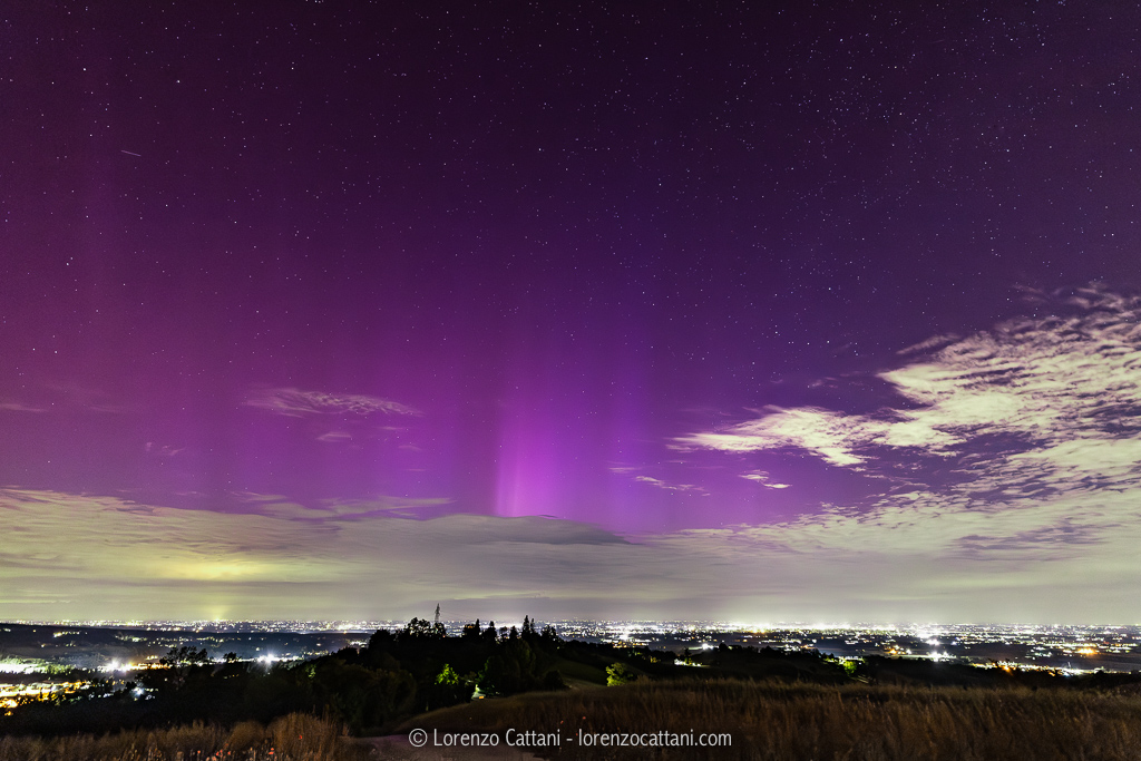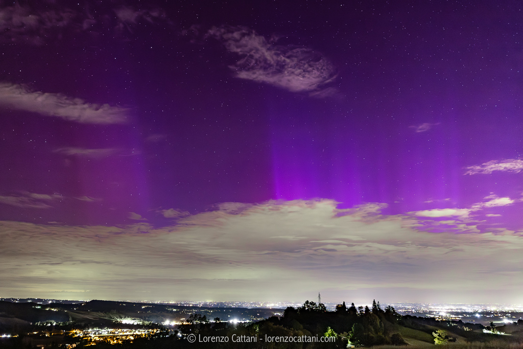 Le aurore non hanno interessato direttamente i cieli nazionali, infatti l’anello aurorale si trovava sopra alla Germania e alla Francia settentrionale, molto più esteso e molto più a sud del normale, ma comunque a nord delle Alpi. Tuttavia, in generale, il fenomeno risulta molto esteso verticalmente, fino a raggiungere i 600 km di quota; per questo motivo le aurore possono essere visibili anche da molto lontano e quindi guardando verso nord è stato possibile cogliere il vivido bagliore rossastro/rosa del SAR e il violetto/verde delle aurore, basso sull’orizzonte.