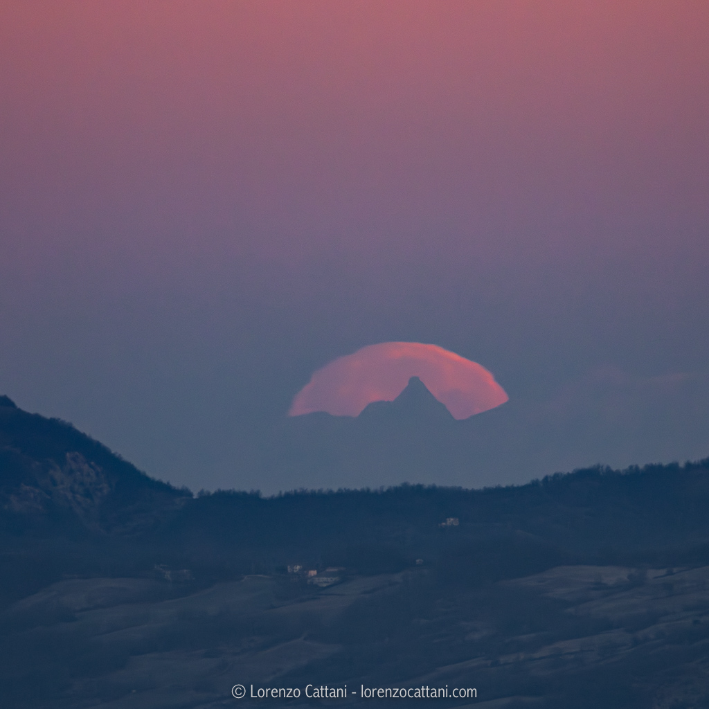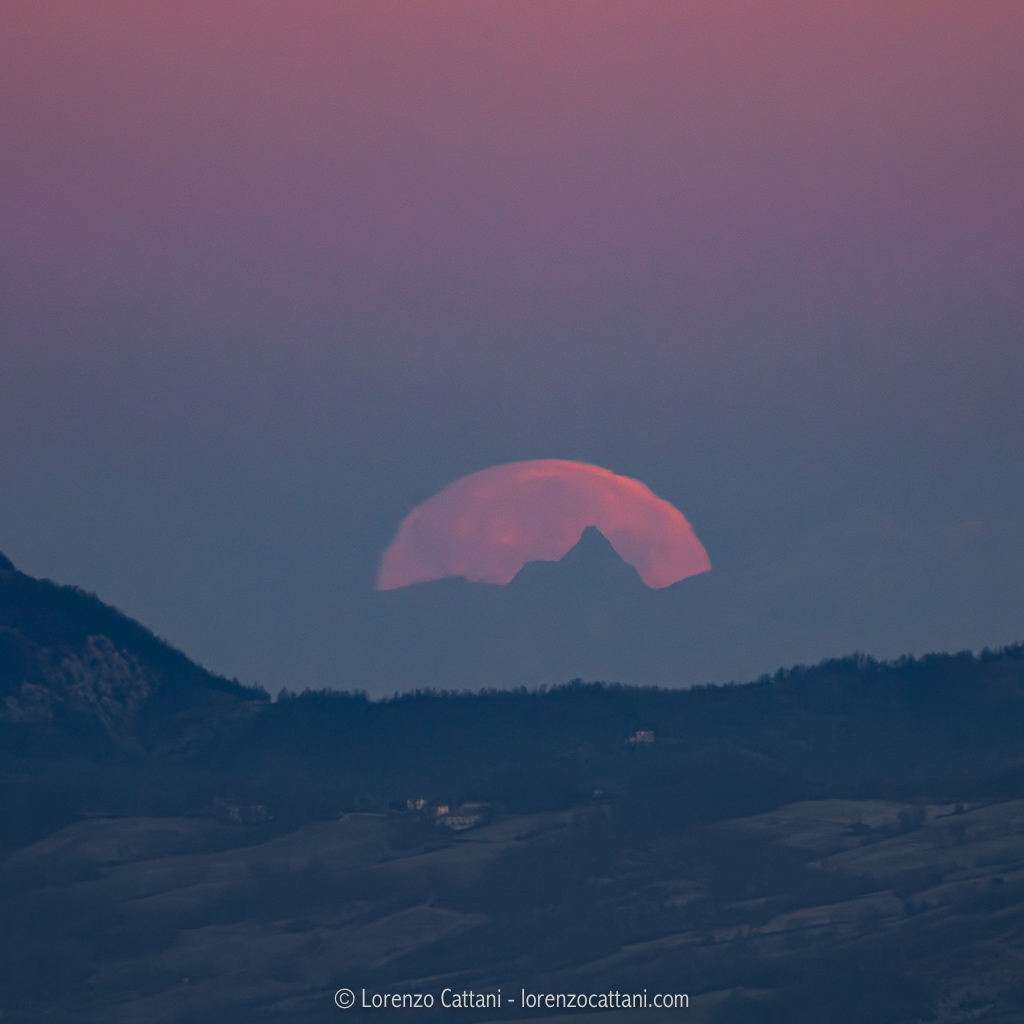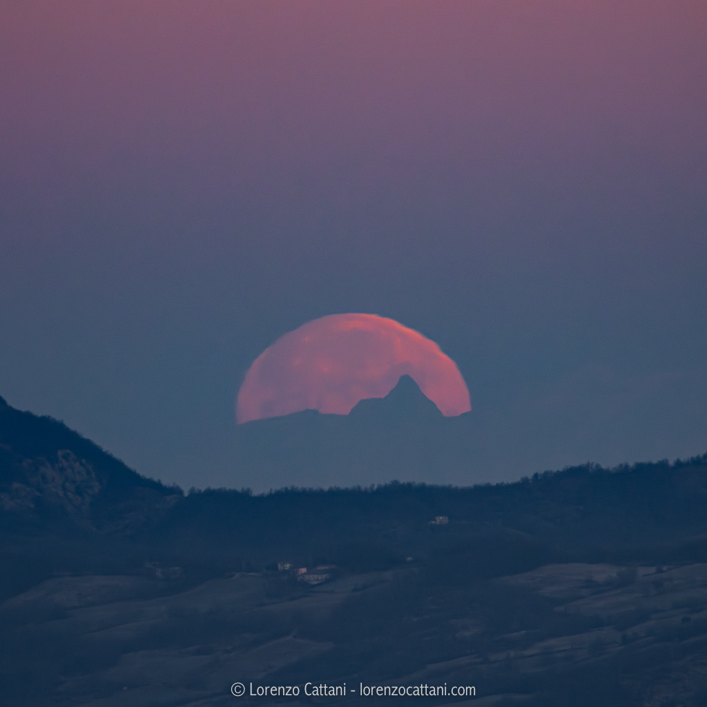 Mi sono quindi messo ad armeggiare su una app dedicata a questo genere di pianificazioni ed in breve tempo ho capito che all’alba del 13 gennaio si sarebbe potuto verificare un incredibile allineamento! Da uno dei “miei” spot in cui si può osservare il Monte Rosa, in zona Cassio Parmense, avrei potuto fotografare la Luna piena (per il 99,3% a quell’ora) mentre tramontava esattamente dietro al Cervino!