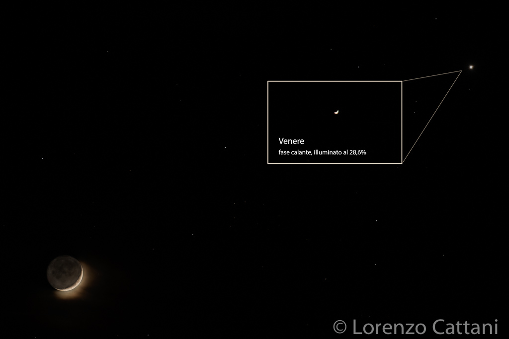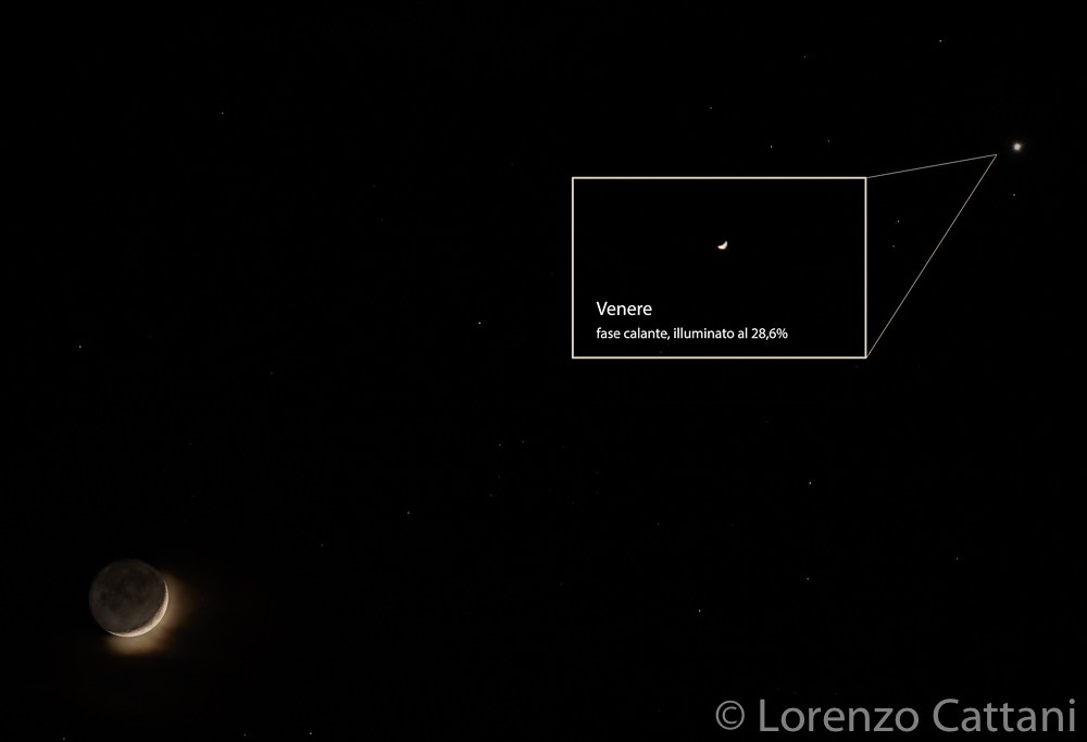 La Luna è in fase crescente, illuminata al 12,5%; Venere è in fase calante, illuminato al 28,6%.