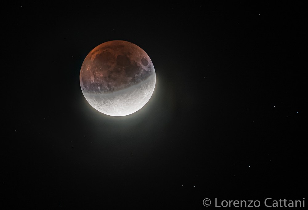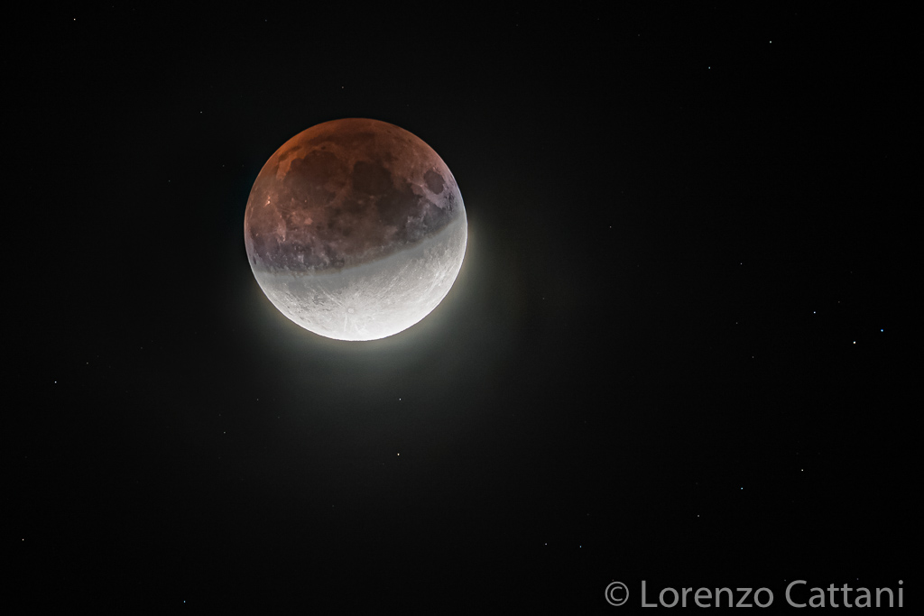 ore 23:32, copertura lunare circa 65%; 400 mm (640 mm eq.); f5,6; ISO 100; doppia esposizione: 4 sec per la parte in ombra; 1/100 sec per la parte in luce