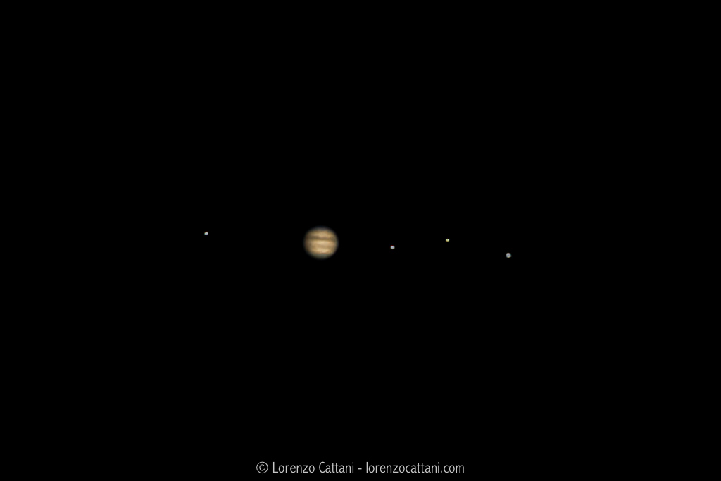 Dati di scatto: Canon EOS 100D; f/8; ISO 100; 1/125 sec per Giove, 1/5 sec per le lune; focale 560mm (eq. 896mm)