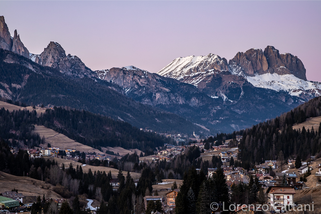 Sassolungo e Sassopiatto con tramonto sulla Val di Fassa