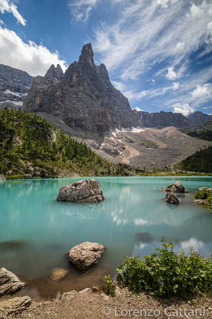 Il lago di Sorapis (1923 m) è situato nel Gruppo del Sorapis, appartenente alle Dolomiti Venete, vicino a Cortina d’Ampezzo. La montagna sullo sfondo è il Dito di Dio (2603 m).