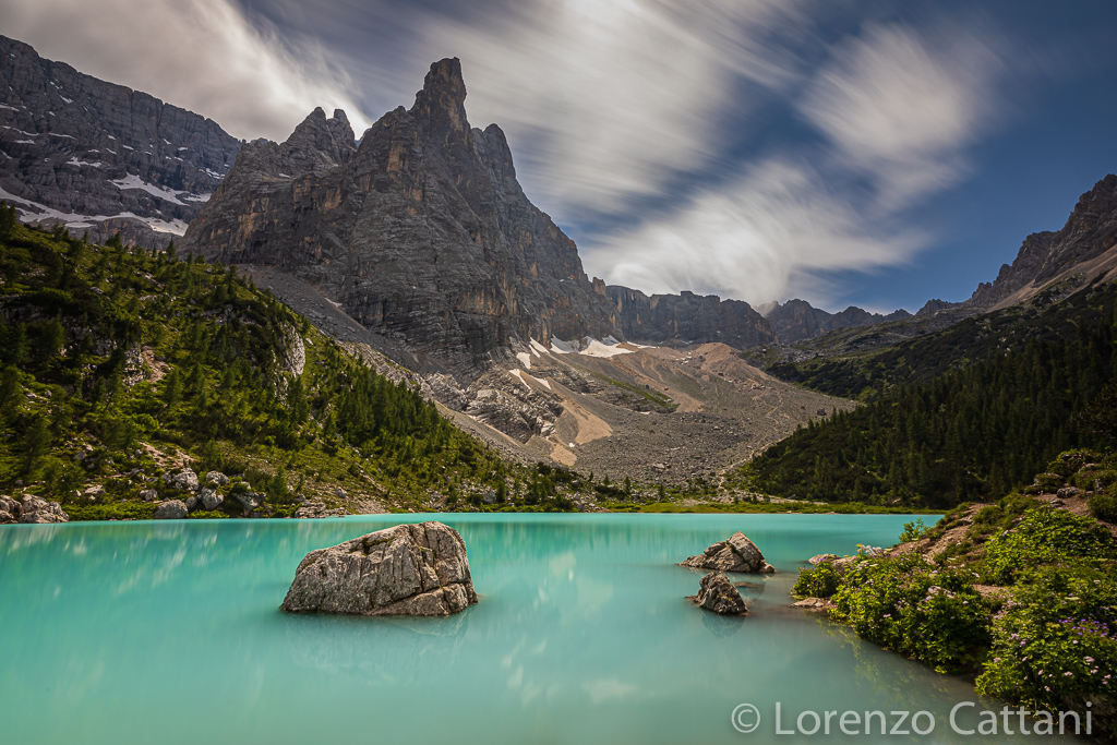 Il lago di Sorapis (1923 m) è situato nel Gruppo del Sorapis, appartenente alle Dolomiti Venete, vicino a Cortina d’Ampezzo. La montagna sullo sfondo è il Dito di Dio (2603 m).