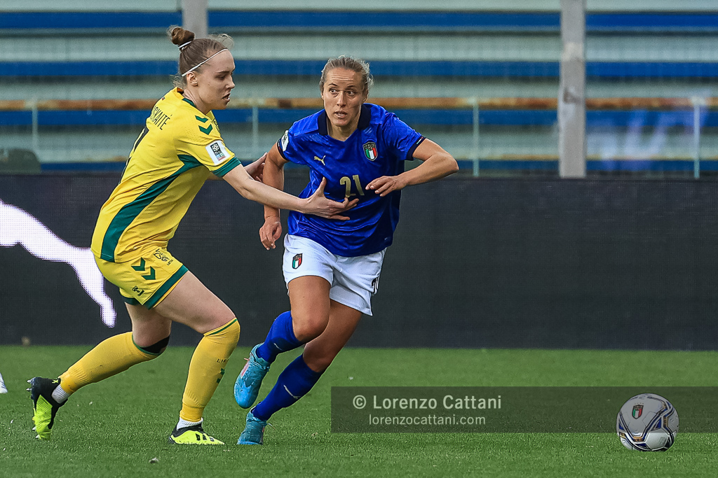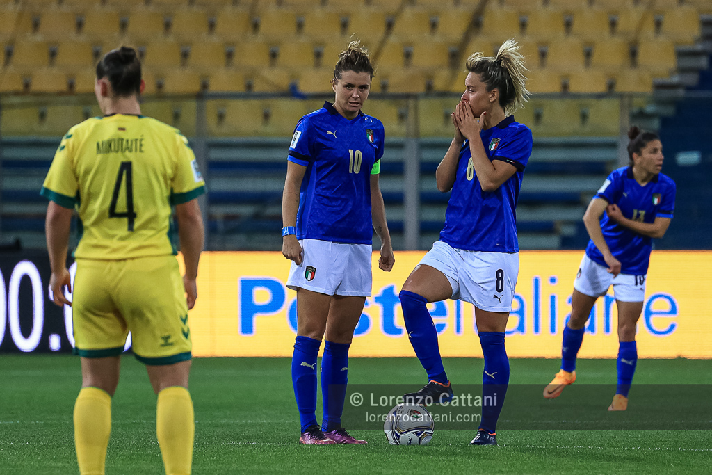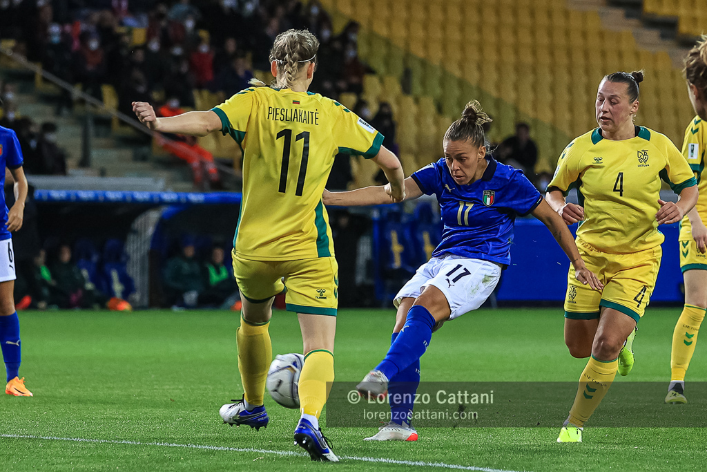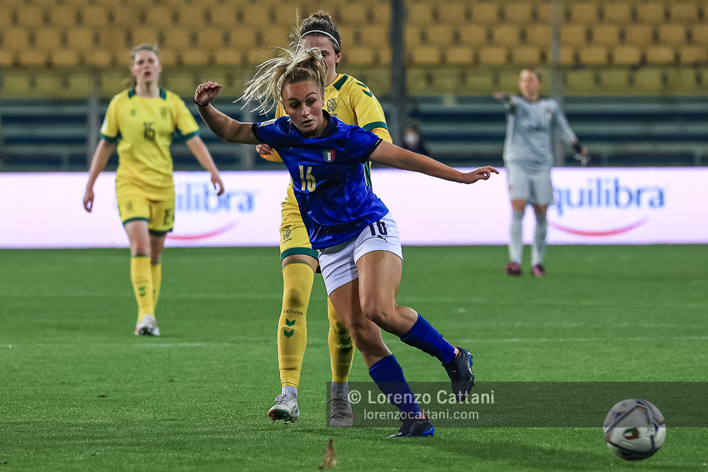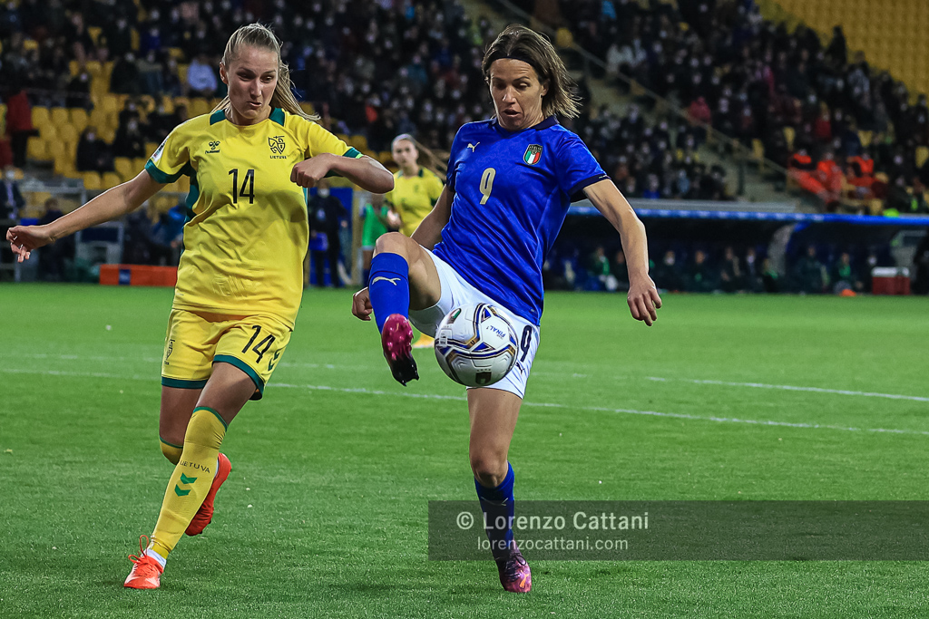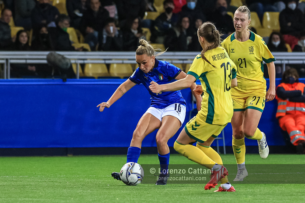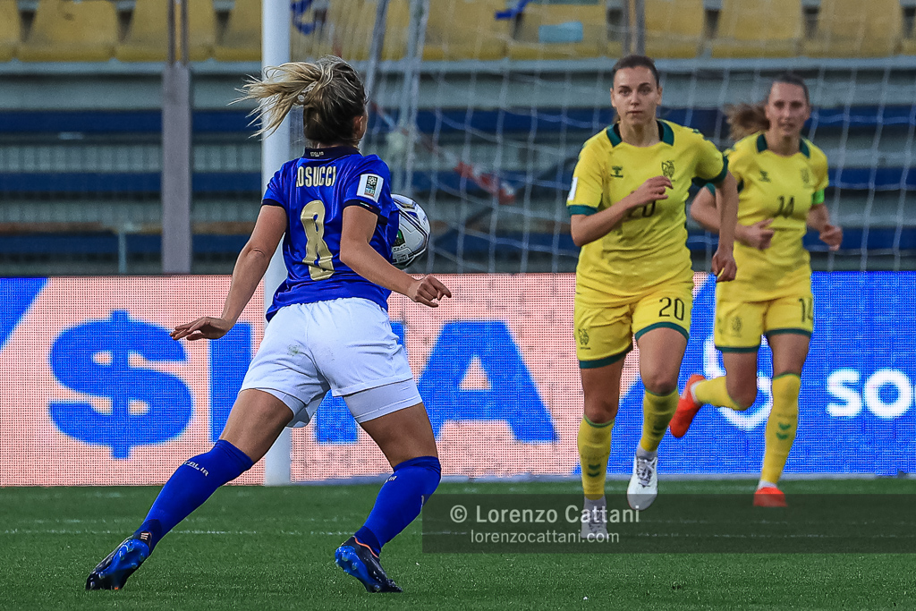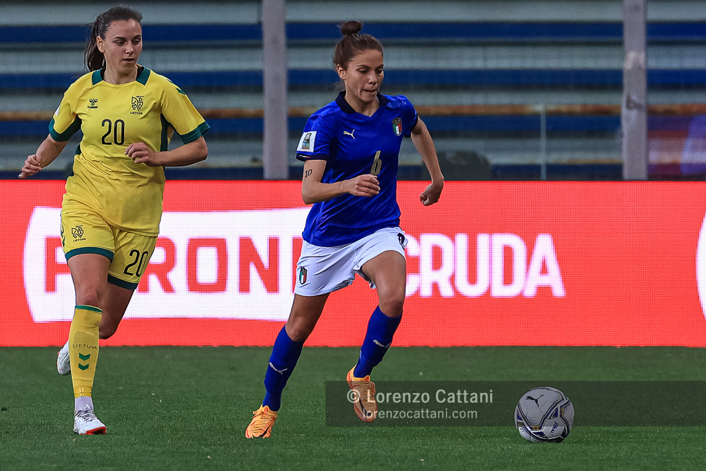 Prosegue con un’altra convincente vittoria il cammino della Nazionale Femminile nelle qualificazioni mondiali. Al Tardini di Parma le Azzurre superano con un perentorio 7-0 la Lituania, regalando ai circa 2500 tifosi presenti sugli spalti una serata di gol, divertimento e grandi giocate. Un monologo iniziato dopo appena un minuto con la rete di Caruso, che ha dato il via alla straripante sinfonia azzurra: al festival del gol si sono iscritte anche Bergamaschi, autrice come la centrocampista bianconera di una doppietta, un’ispiratissima Cernoia e nel finale le subentrate Sabatino e Bonetti.