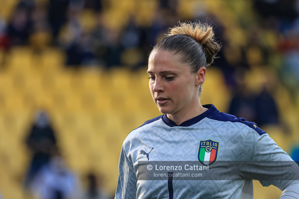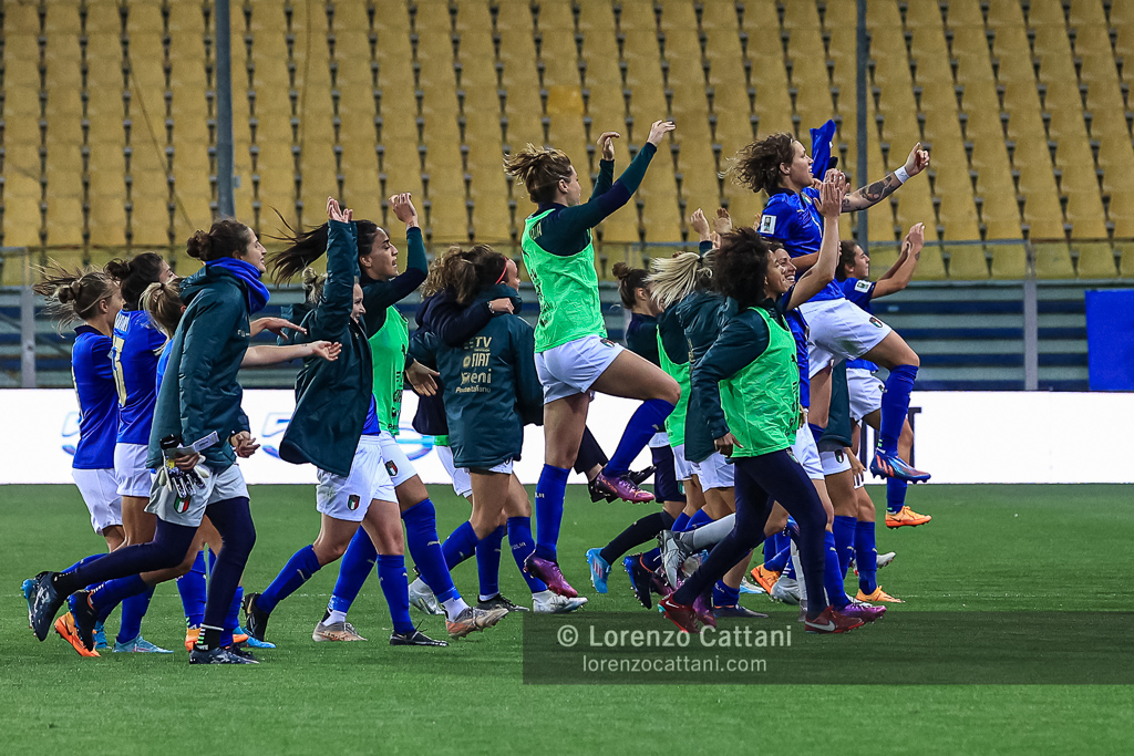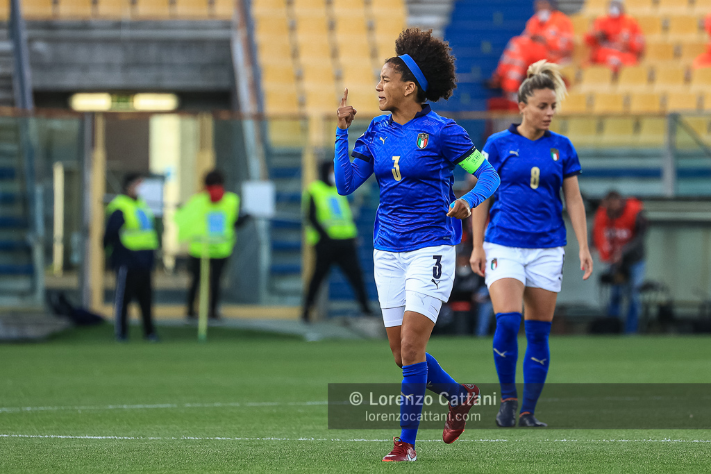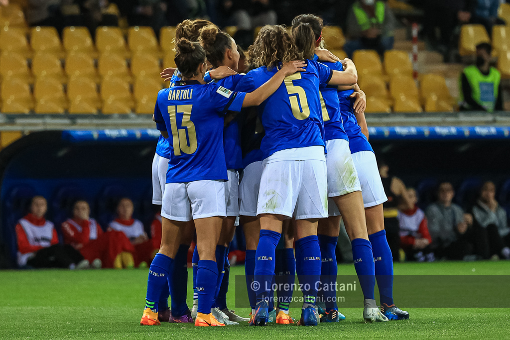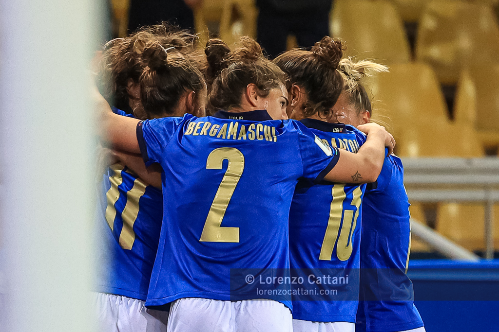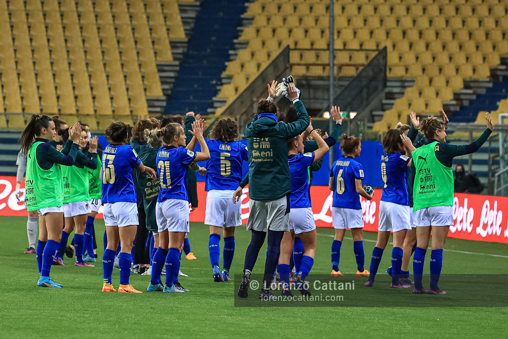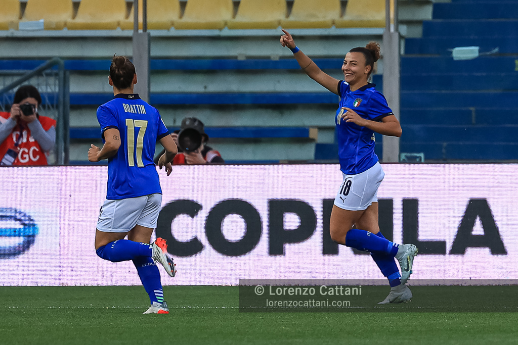 La Ct Bertolini si affida nuovamente alla difesa a quattro, schierando Bergamaschi e Boattin ai lati della coppia centrale formata da Gama e Linari. In mezzo al campo c’è Rosucci, che insieme alle compagne di reparto Giugliano e Caruso ha il compito di innescare le tre bianconere Cernoia, Bonansea e Girelli. In avvio di gara il forte vento che soffia sul Tardini sembra poter influire negativamente sul fraseggio azzurro, un timore che svanisce però dopo poco più un minuto, quando Cernoia ha modo di stoppare con calma il pallone sulla trequarti e di lanciare in profondità Caruso, che dopo essere entrata in area con un comodo diagonale trova l’immediato 1-0.