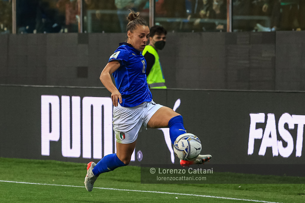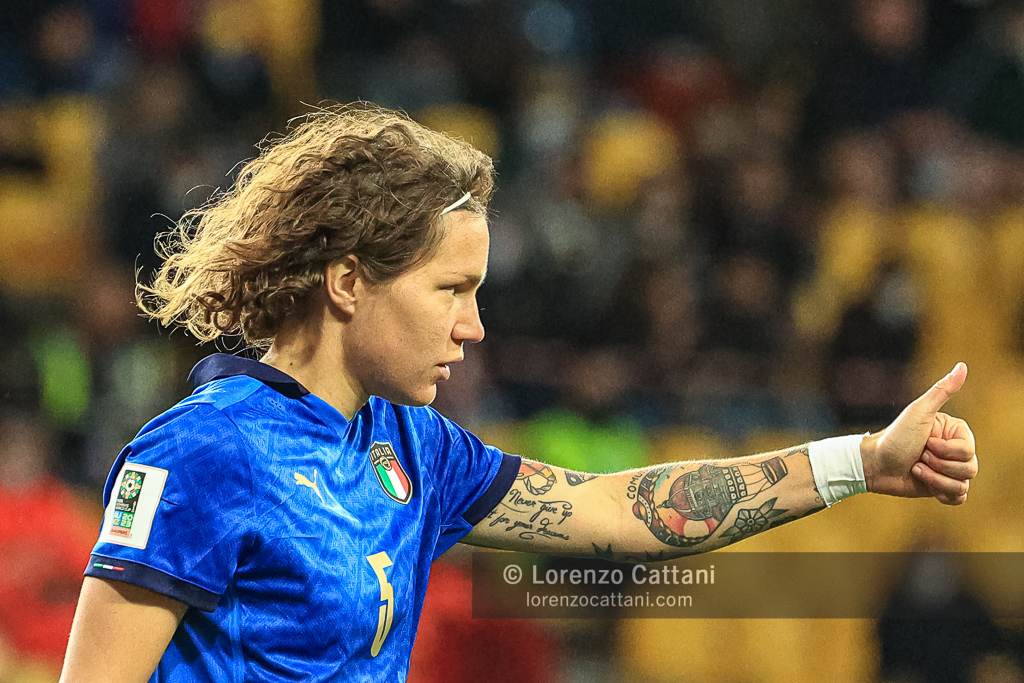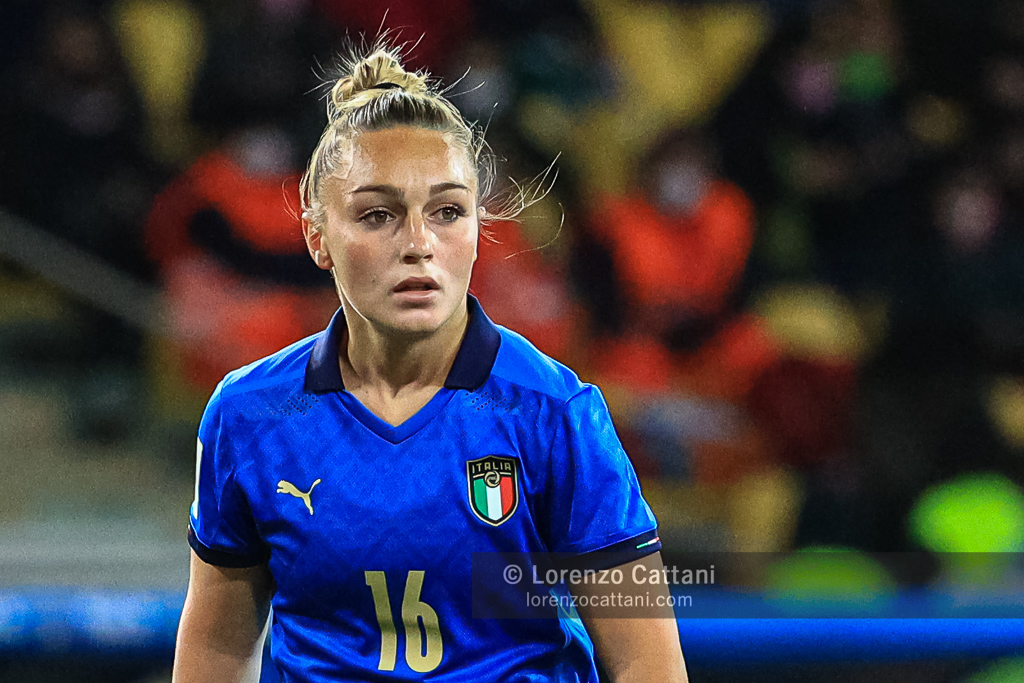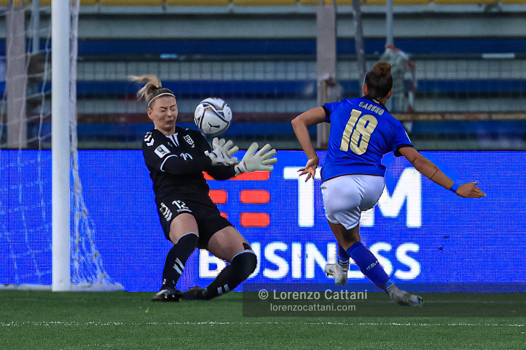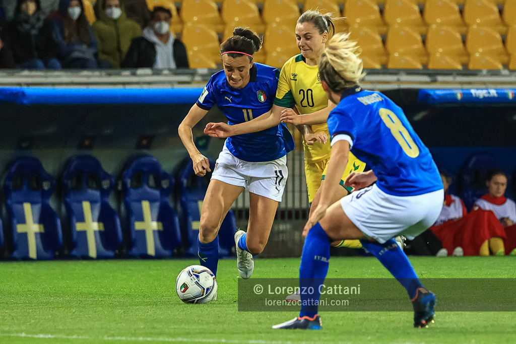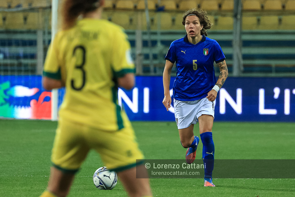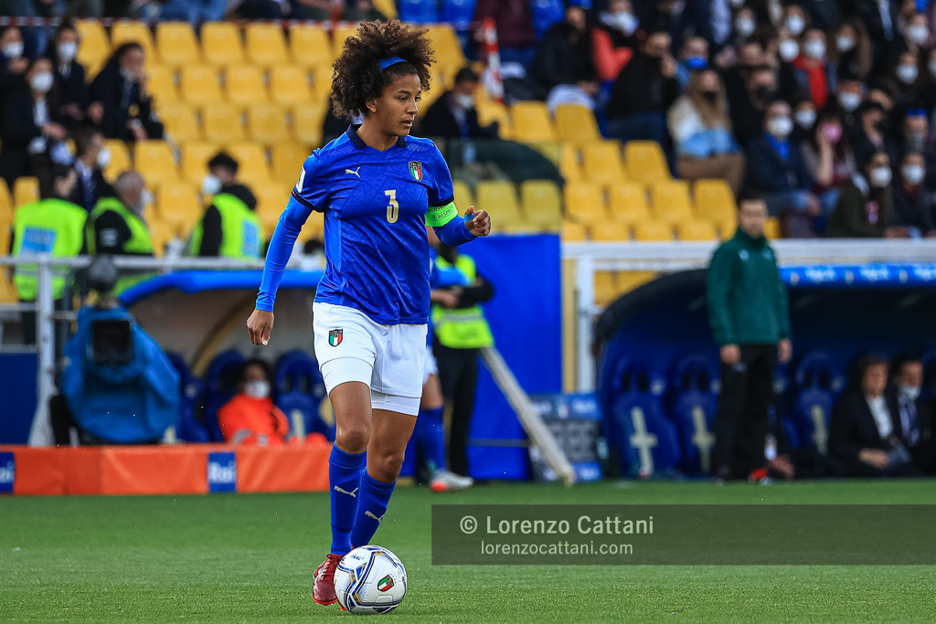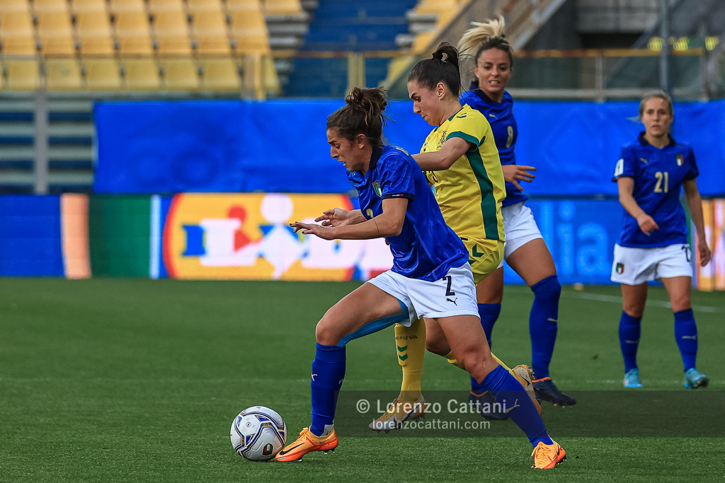 La Ct Bertolini si affida nuovamente alla difesa a quattro, schierando Bergamaschi e Boattin ai lati della coppia centrale formata da Gama e Linari. In mezzo al campo c’è Rosucci, che insieme alle compagne di reparto Giugliano e Caruso ha il compito di innescare le tre bianconere Cernoia, Bonansea e Girelli. In avvio di gara il forte vento che soffia sul Tardini sembra poter influire negativamente sul fraseggio azzurro, un timore che svanisce però dopo poco più un minuto, quando Cernoia ha modo di stoppare con calma il pallone sulla trequarti e di lanciare in profondità Caruso, che dopo essere entrata in area con un comodo diagonale trova l’immediato 1-0.